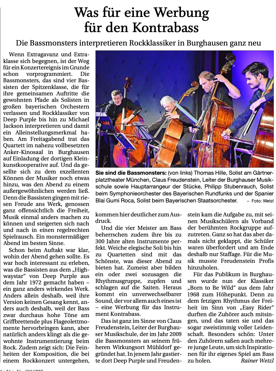 „Was für eine Werbung für den Kontrabass – Die Bassmonsters interpretieren Rockklassiker in Burghausen ganz neu“ (Rainer Wetzl – PNP)